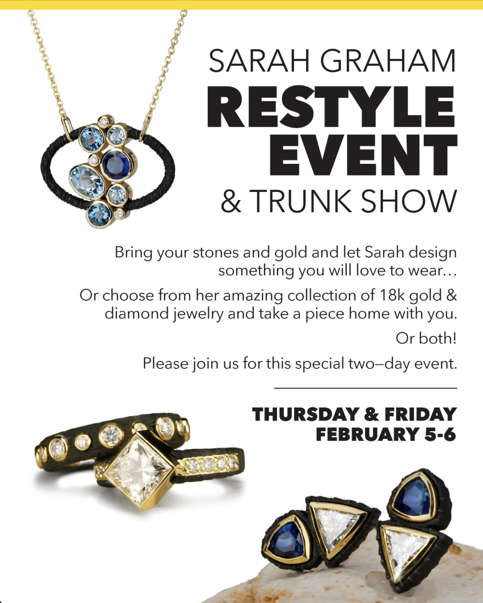 This year we’re adding to the show with a ReStyle Event– gather your unworn gemstones and work with Sarah to design something completely original. It’s a great opportunity to work with an acclaimed jewelry designer to create your own personal piece of jewelry.